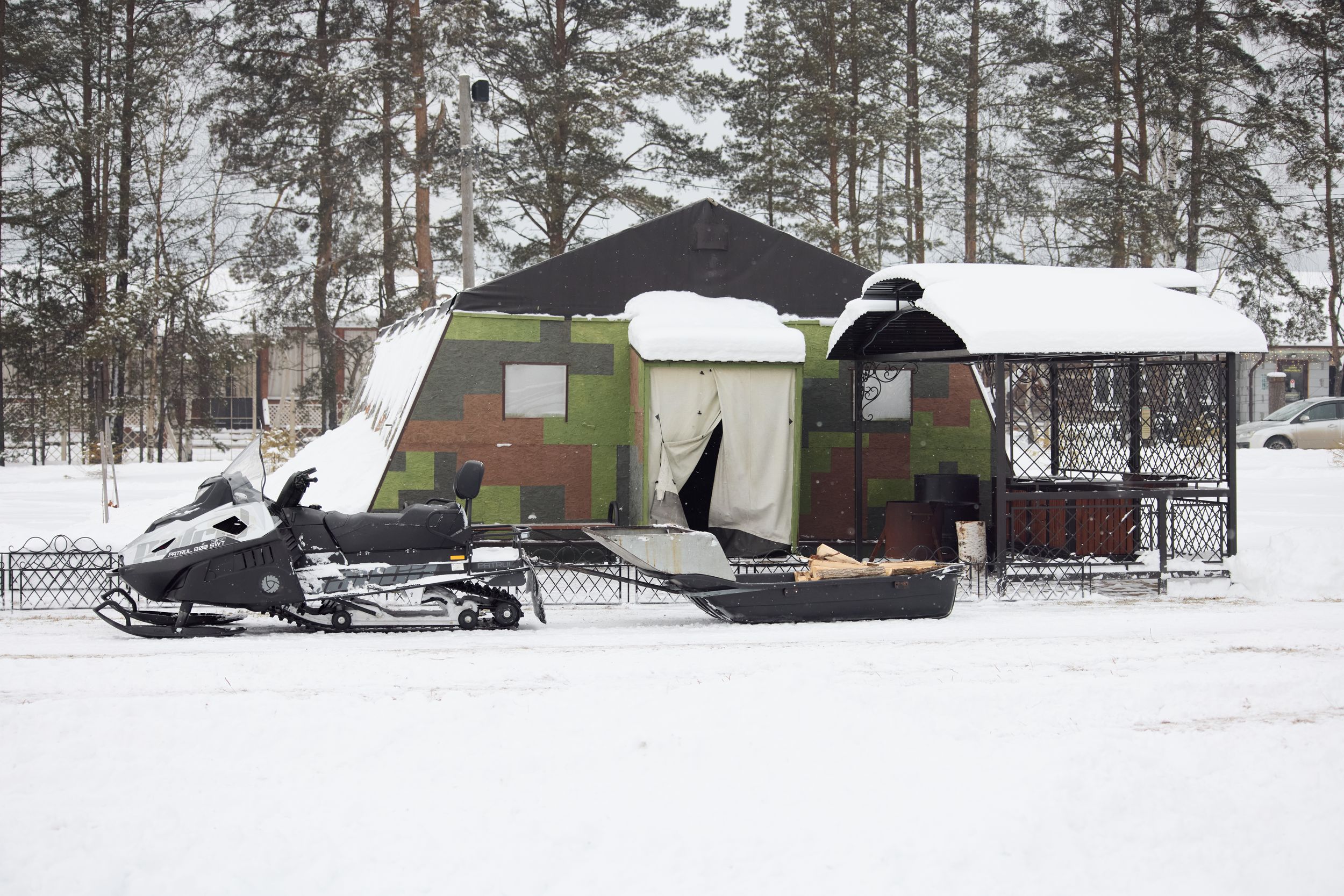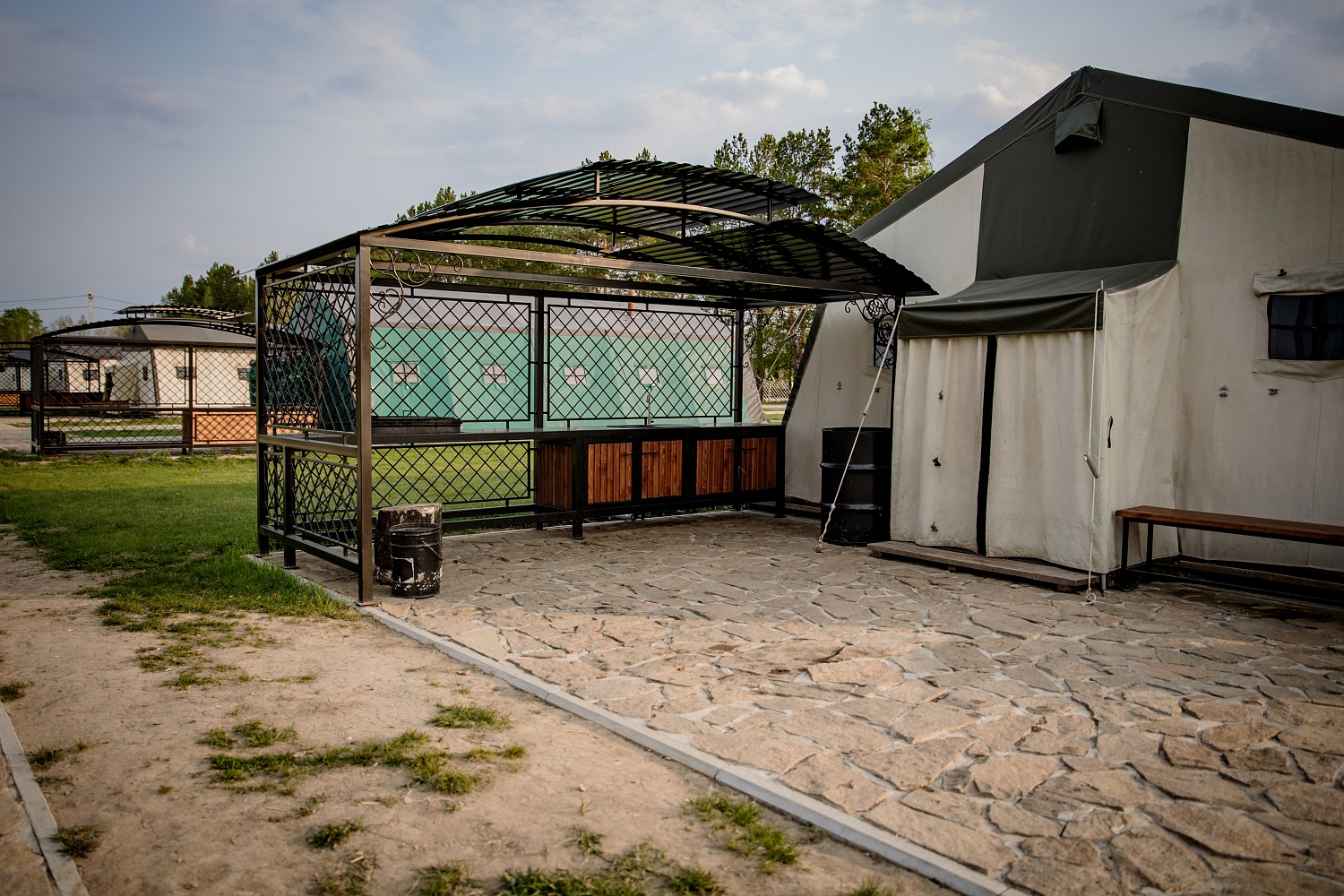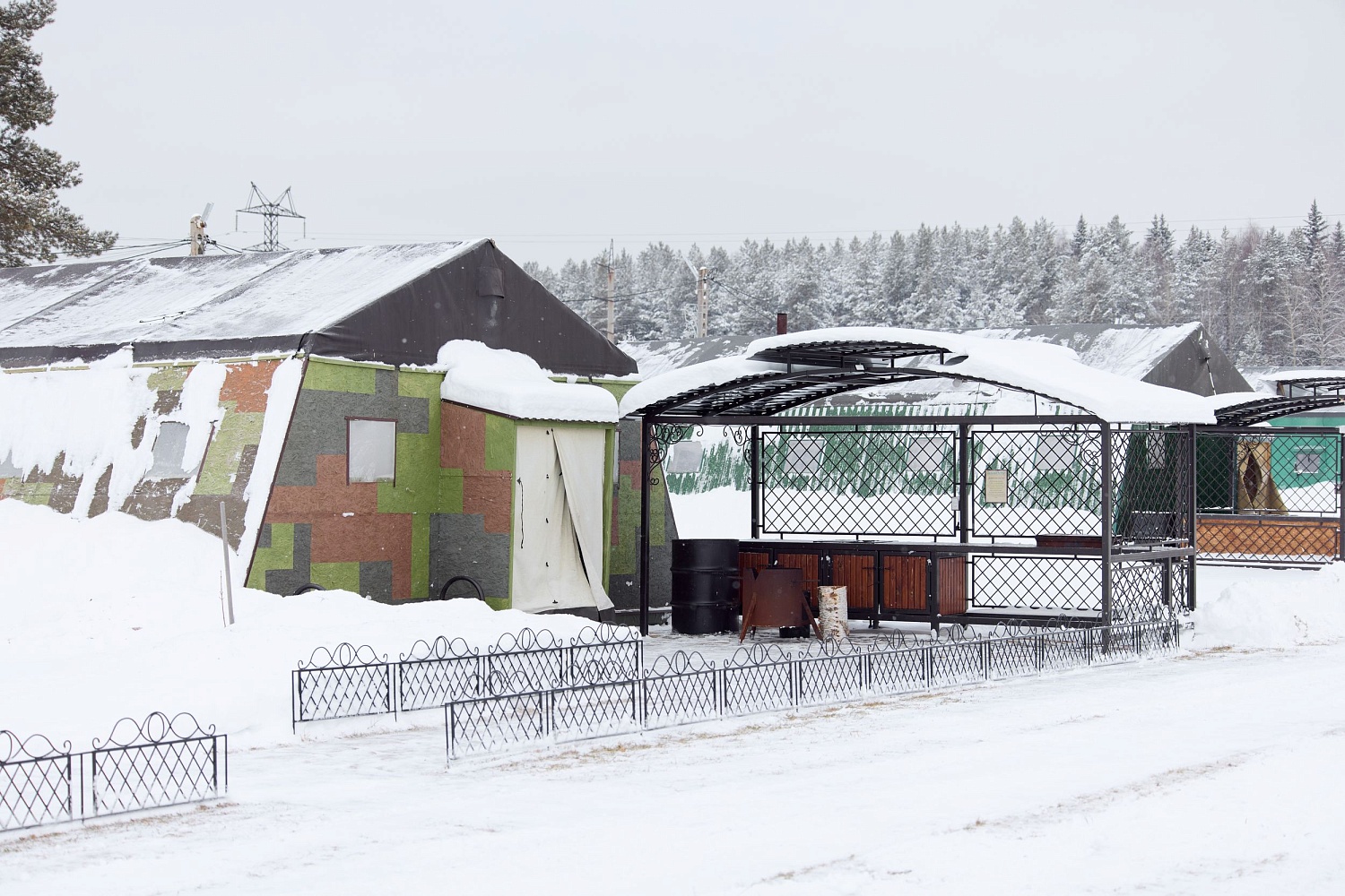 Внутри: столы и лавочки, чайник, питьевая вода, музыкальный центр, умывальник, обогреватель.